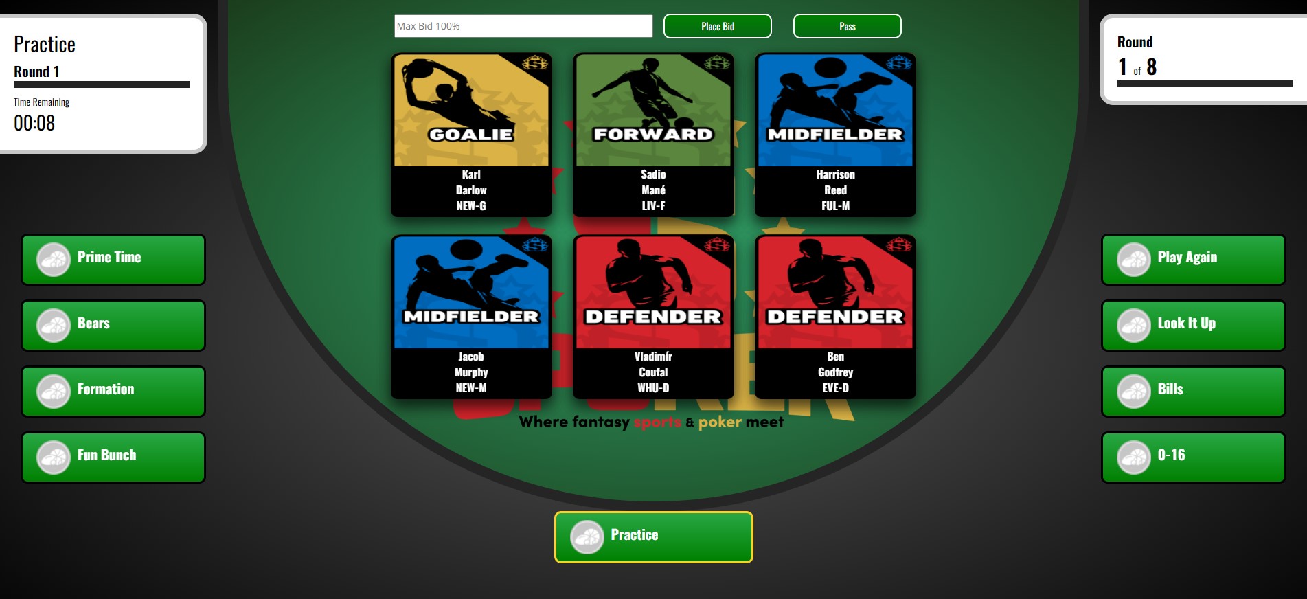 Format - Spoker is played in groups consisting of nine (9) people. These contestants bid on eight teams over 8 rounds. This means one person is eliminated during the bidding process and does not receive a team for the competition.
