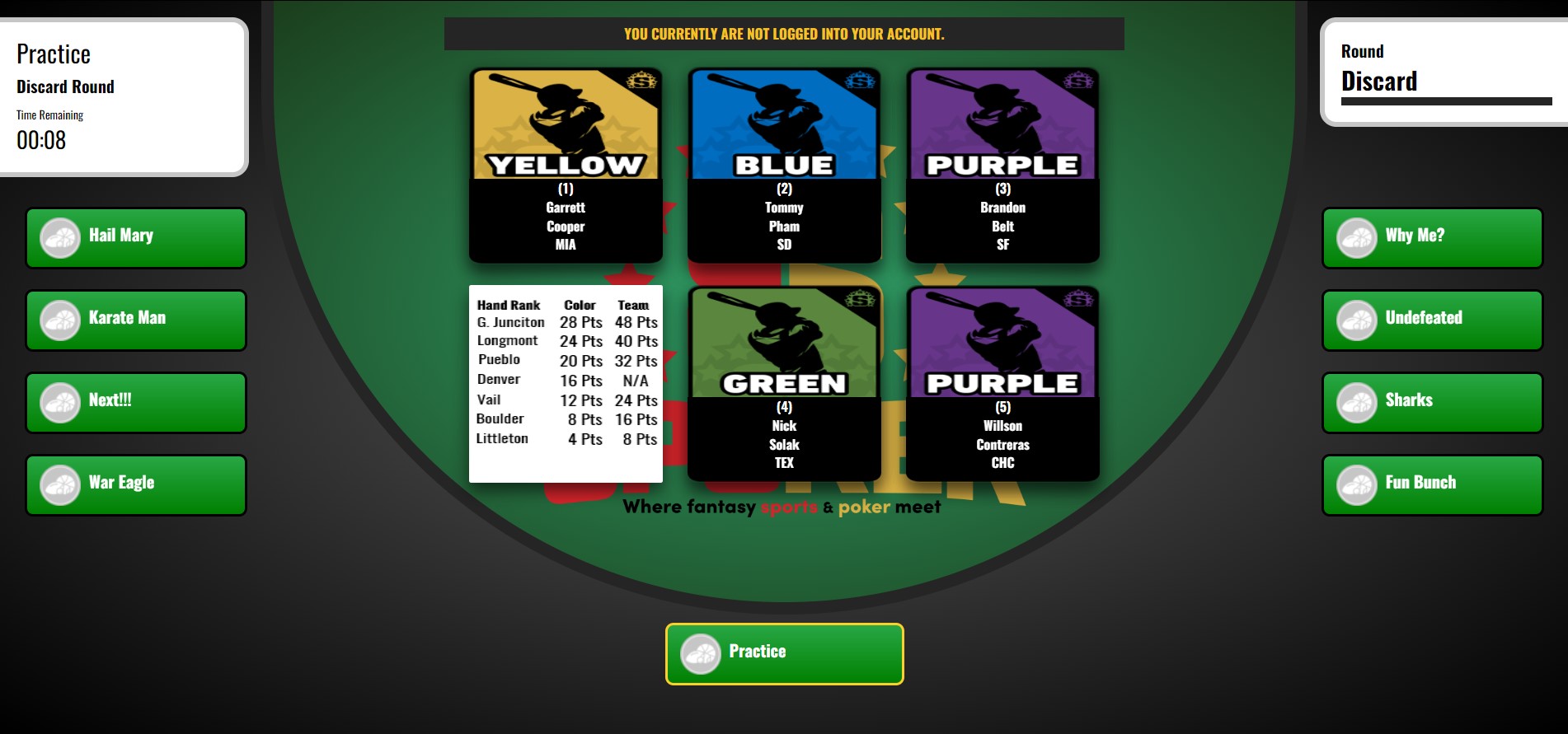 Scoring - Scoring is based on two parts. First, the fantasy point values of each of the 5 cards are added together. Second, bonus points are awarded for both color combinations and having teammates.